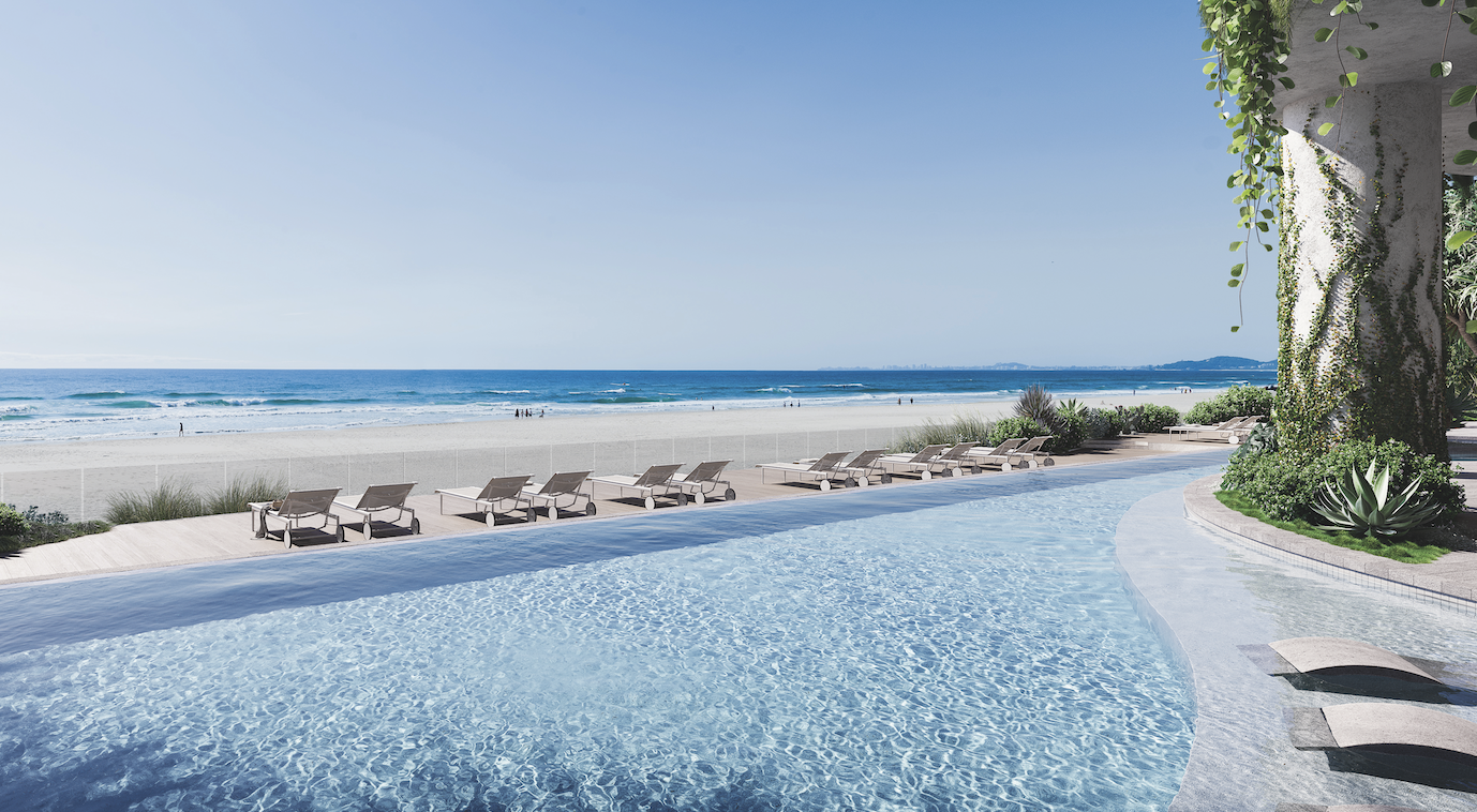 With architecture by DKO Architecture and interiors by Mim Design, Royale Gold Coast is offering future residents six-star lifestyle amenities including a café, concierge service, a porte cochere and a beach club on the elevated ground floor with two pools, daybeds and lounges.